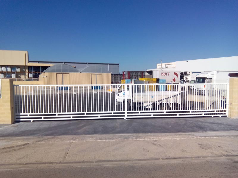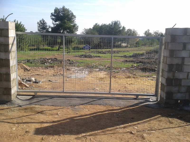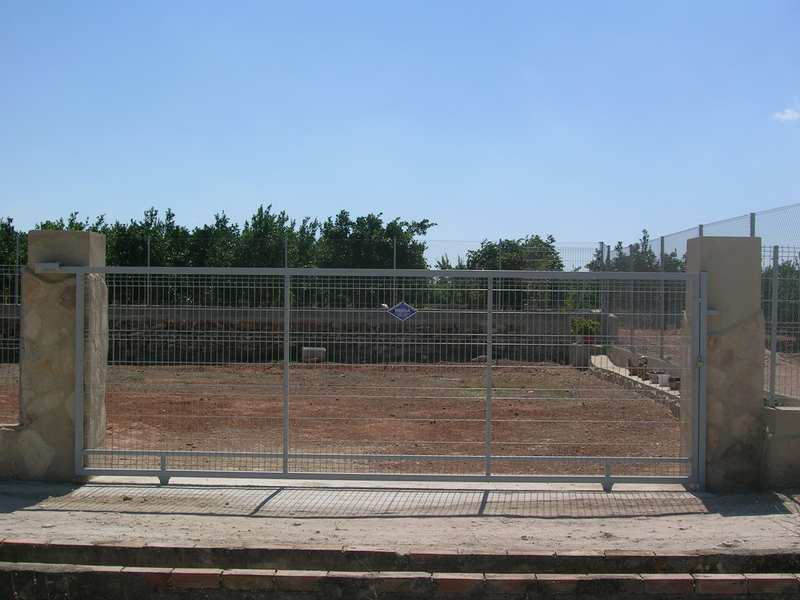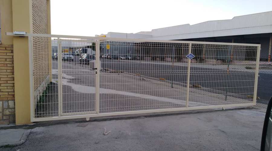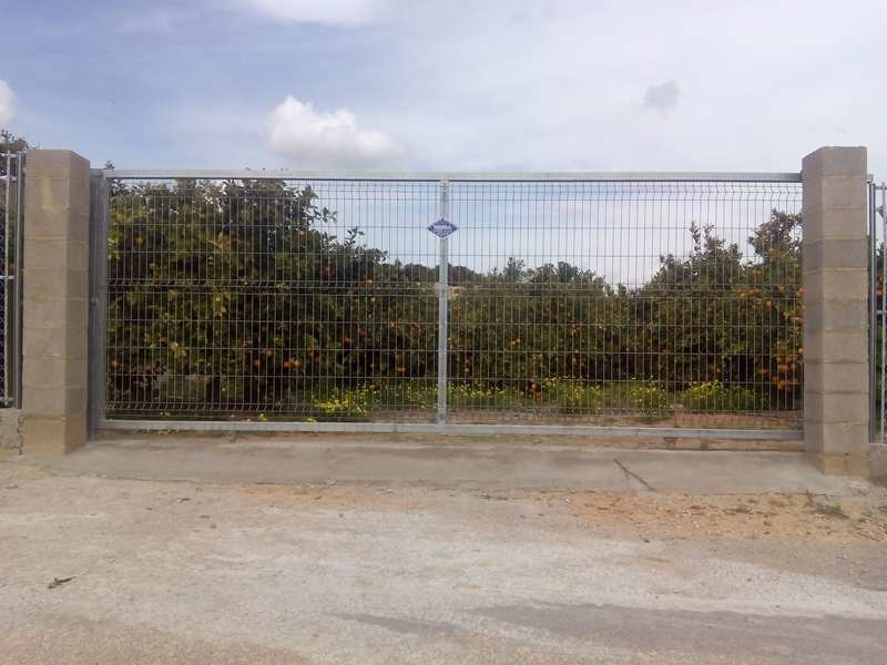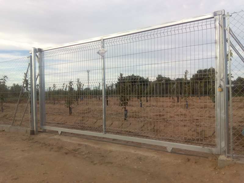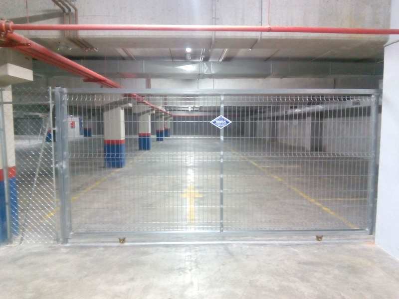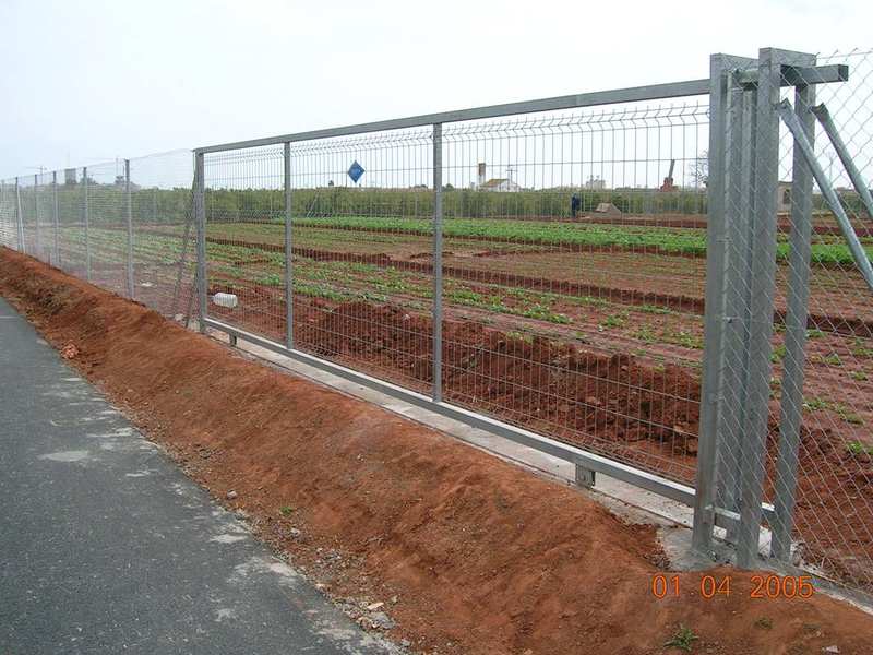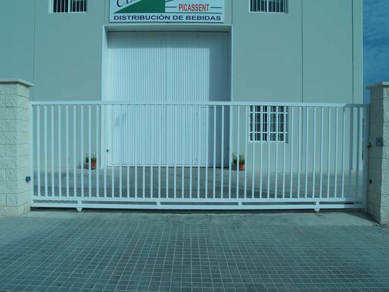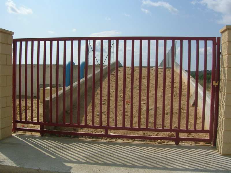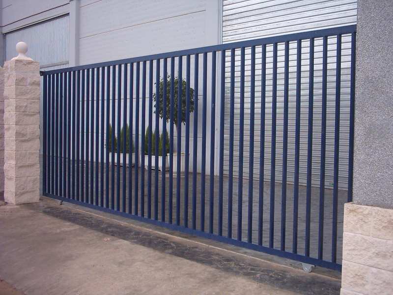 Puertas formadas con perfiles cuadrados, ruedas provistas de rodamientos, carril guía para empotrar o atornillar en el pavimento, puente guía con rodillos regulables de nylon y columna para cierre, guarnecida con barrotes de sección cuadrada. Cerradura opcional.